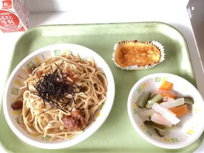 今日の給食は、照り焼きチキンとごぼうのスパゲティ、ピクルス、チーズケーキ、牛乳です。
