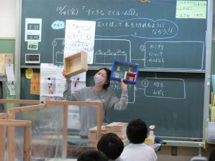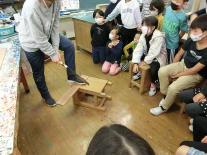 のこぎりの使い方を図工専科の先生から丁寧に説明してもらい、