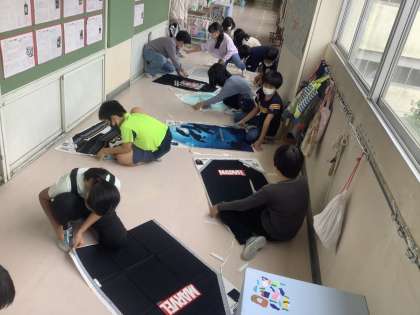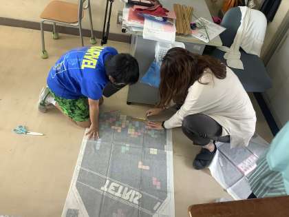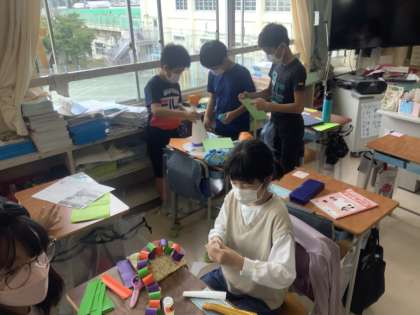 隣のクラスを見ると、今度はキラキラした飾りを楽しそうに作っていました。こちらのクラスは家庭科ではなく、月末に行うハロウィンパーティーの準備をしているようです。どんなパーティーになるのか、楽しみですね。