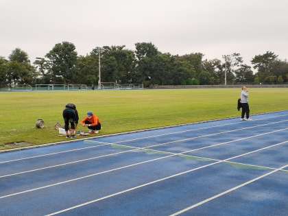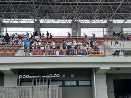 連合運動会に参加する6年生、砧の総合運動公園に到着。スタジアムに開会式を待っています。