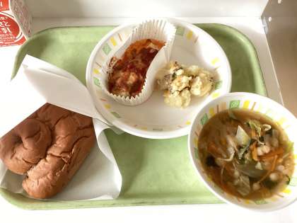 今日の給食は、ココアパン、タラのピザ風焼き、カルボナーラポテト、白いんげんの田舎風スープ、牛乳です。