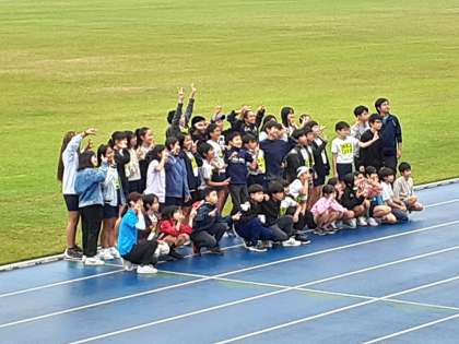 連合運動会に参加した6年生、最後にトラックに降りて、お決まりの学年全体写真をパチリ。
