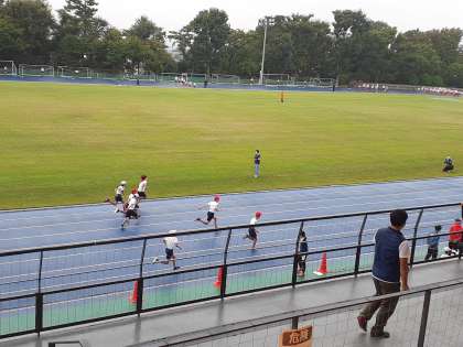連合運動会に参加している6年生、曇天の中でも、自己の最高記録を出すように走り、跳び、繋いでいます。