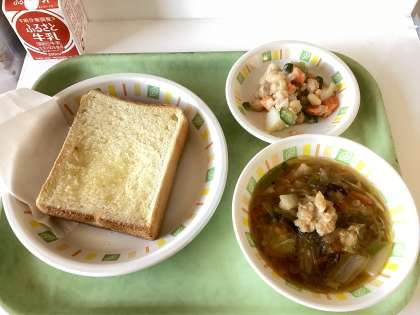 今日の給食は、シュガーバタートースト、肉団子入り春雨スープ、ビーンズサラダ、牛乳です。