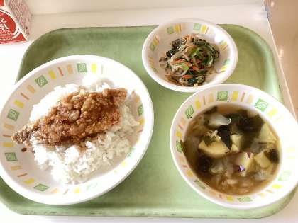 今日の給食は、あじのかば焼き丼、野菜の乾物和え、さつま芋のみそ汁、牛乳です。