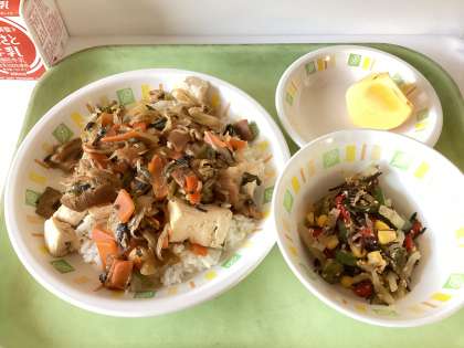今日の給食は、すき焼き丼、大根とひじきのサラダ、柿、牛乳です。