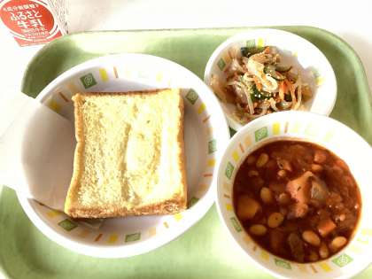 今日の給食は、フレンチトースト、ポークビーンズ、こんにゃくサラダ、牛乳です。