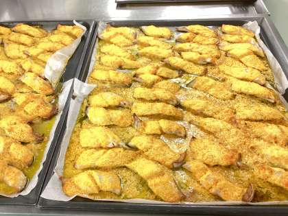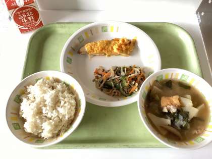 今日の給食は、七分つきご飯、シイラのあけぼの焼き、もやしののり酢あえ、イナムドゥチ(沖縄の郷土料理)、牛乳です。あけぼの焼きのオレンジ色は、にんじんのすりおろしとマヨネーズです。