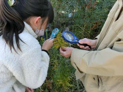 虫眼鏡で、花や実、たねを観察する子、