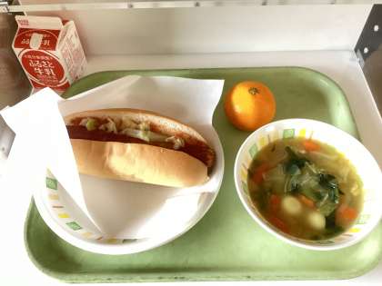 今日の給食は、ホットドック、カレーポトフ、みかん、牛乳です。
