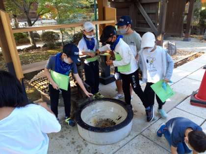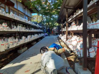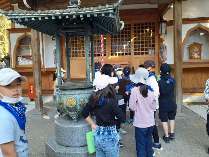 社会科見学中の3年生、豪徳寺の境内では、グループ見学をしています。
