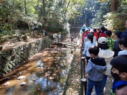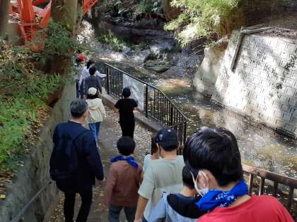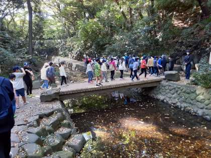 社会科見学の3年生、23区内で唯一の渓谷、等々力渓谷に来ています。