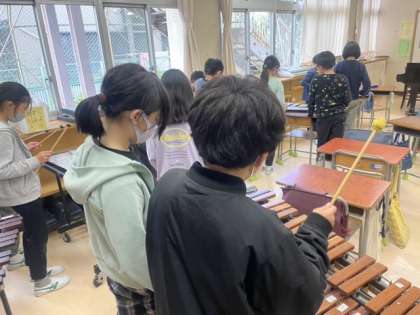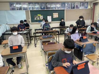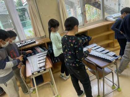 今、音楽の時間ではソーラン節の音階を使って音楽づくりをしています。