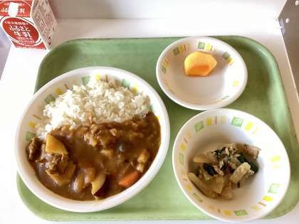今日の給食は、秋野菜カレーライス、和風大根サラダ、おけさ柿、牛乳です。