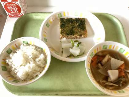 今日の給食は、ごはん、松風焼き、かぶの甘酢かけ、のっぺい汁、牛乳です。