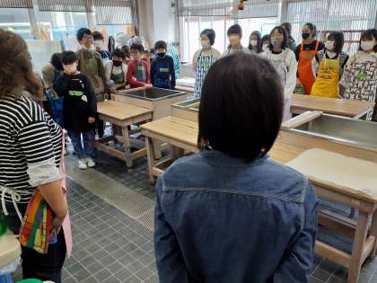6年1組が紙漉き体験をするため、山崎小学校内にある紙漉き教室を訪れています。