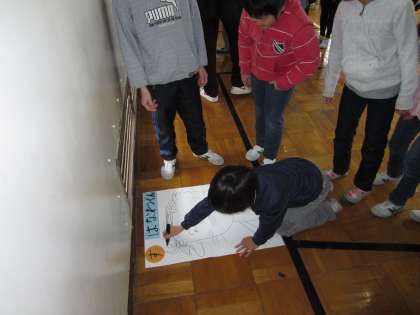 なかよし班(縦割り班)で力を合わせて、お題のキャラクターをかきあげるゲームをしました。