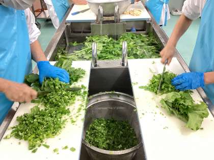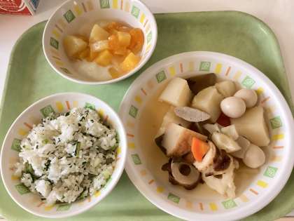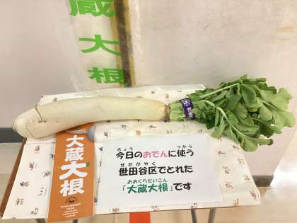 今日の給食は、青菜とじゃこのごはん、大蔵大根のおでん、フルーツヨーグルト、牛乳です。今日は世田谷区産の大蔵大根を32kg使いました。