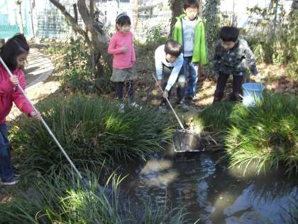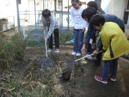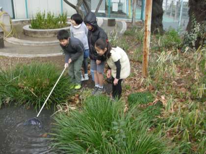3年生は、「ビオトープをのぞいてみよう」の学習をしました。1組は1・2校時、2組は3・4校時に「人と自然の研究所」の方々を招き、ビオトープで暮らしている生き物の観察をしました。寒い水の中でも元気に生きているヤゴを見つけ、教室で観察をしました。