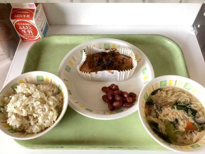 今日の給食は、七分つきごはん、鮭のねぎたっぷりちゃんちゃん焼き、煮豆、きのこ入りかきたま汁、牛乳です。