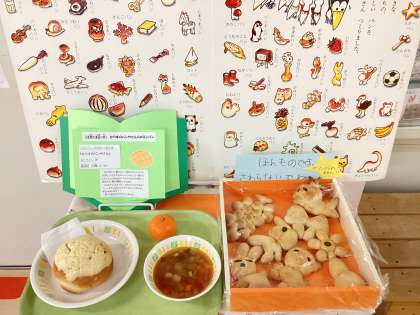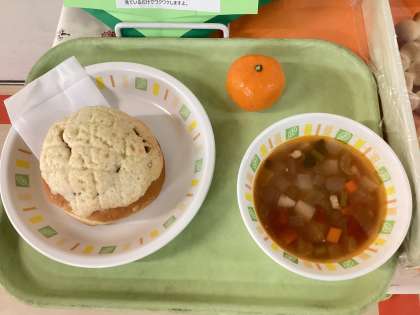 今日の給食は、からすのパンやさんのメロンパン、ミネストローネ、みかん、牛乳です。
