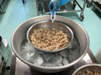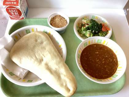 今日の給食は、キーマカレー&ナン、ブロッコリーとツナのサラダ、黒蜜寒天、牛乳です。