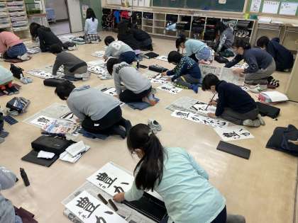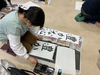 本番用の長い半紙にチャレンジします。