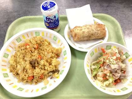 今日の給食は、ツナカレーピラフ、シーザースサラダ、ホットアップルパイ、牛乳です。