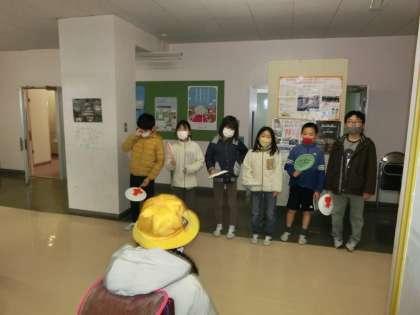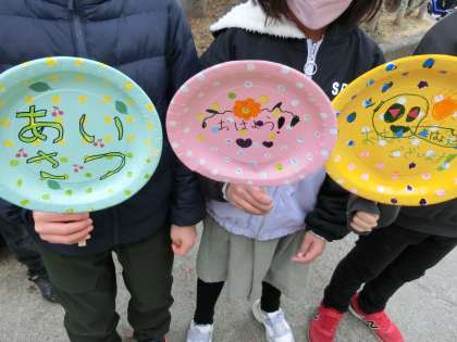 以前に作成した、あいさつ運動を盛り上げるための手作りうちわを持って、3年生らしく元気にあいさつをしてくれました。
