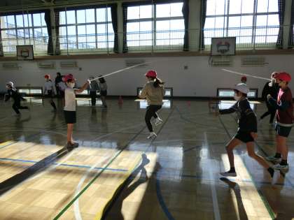体育朝会で行われる「長縄跳び」の練習をしました。