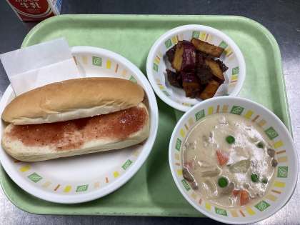今日の給食は、いちごジャムコッペサンド、くじらとさつま芋の揚げ煮、ホワイトシチュー、牛乳です。くじらは、食べやすいように揚げてから、甘辛く味を付けました。