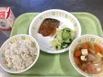 今日の給食は、麦ごはん、さばのみそ煮、野菜のひとしお、けんちん汁、牛乳です。