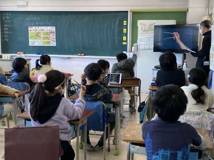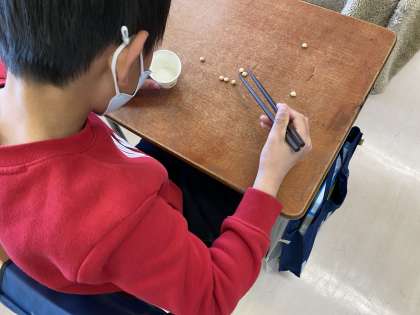 初めに動画を見てから、皆で正しいお箸の持ち方を練習し、