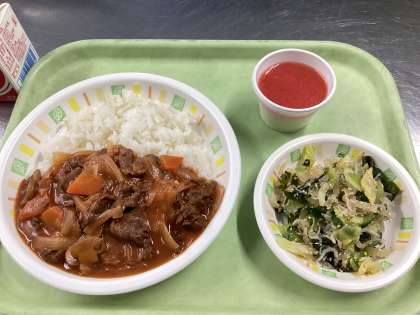 今日の給食は、ハッシュドビーフライス、じゃことわかめのサラダ、パンナコッタ いちごソース牛乳です。