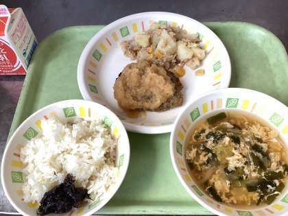 今日の給食は、七分つきごはん、のりの佃煮、和風ハンバーグ、ツナコーンポテト、にらたまみそ汁、牛乳です。