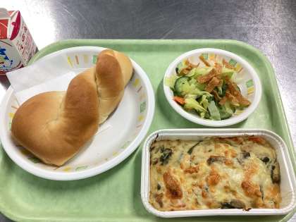 今日の給食は、チーズパン、豆腐と豆乳のグラタン、パリパリサラダ、牛乳です。