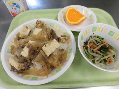 今日の給食は、焼豆腐入り牛丼、野菜の乾物和え、清見オレンジ、牛乳です。