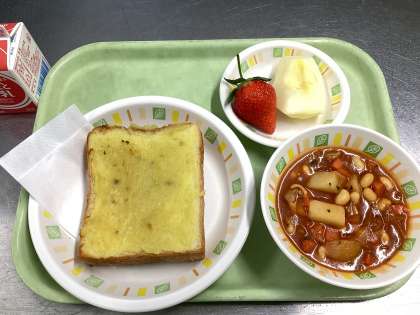 今日の給食は、スイートポテトースト、チキンビーンズ、いちご(やよいひめ)&りんご(サンフジ)、牛乳です。今日のいちごは、一口では食べられないくらいの大きさでした。