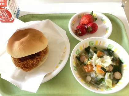 今日の給食は、ヒレカツバーガー、マカロニスープ、いちご(やよいひめ、あまおう)、牛乳です。