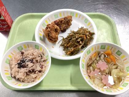 今日の給食は、赤飯、鶏肉のからあげ、五目きんぴら、春の祝い汁、りんごジュースです。今日はいつもよりひと回り大きなからあげにしました。保護者の皆様、一年間学校給食にご理解、ご協力いただき、ありがとうございました。