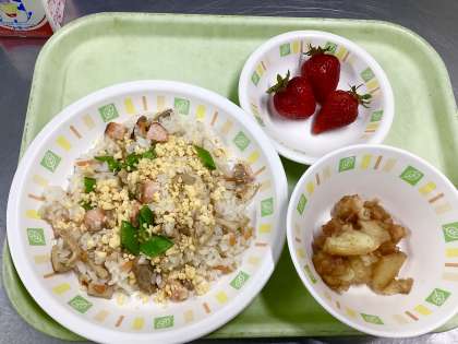 今日の給食は、鮭ちらし、いかとじゃが芋の揚げ煮、いちご(あまおう)、牛乳です。