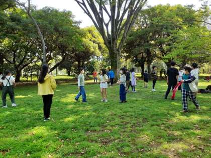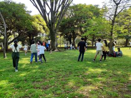 広場で鬼ごっこに歓声をあげていました。