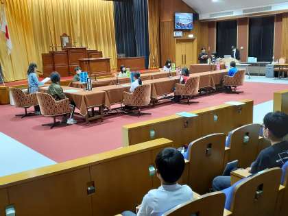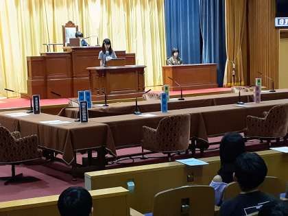 まず、委員会室での審査。さらに、本会議場を模した議場で、全員が議員になり、議事の討論、そして、採決と進めていきました。採決では、自席にあるボタンを押して、賛成、反対の票を投じていました。