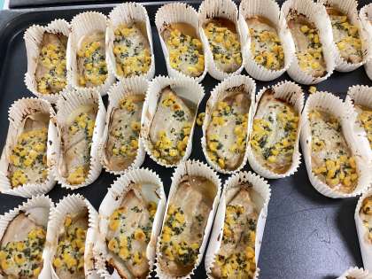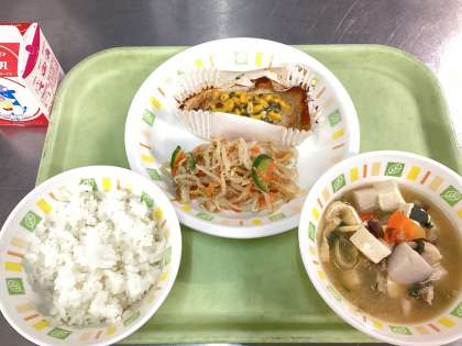 今日の給食は、ごはん、魚(シイラ)のコーンマヨネーズ焼き、もやしのごま酢和え、豚汁、牛乳です。