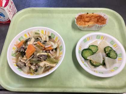 今日の給食は、みそうどん、きゅうりと大根のごま風味、チーズケーキ、牛乳です。