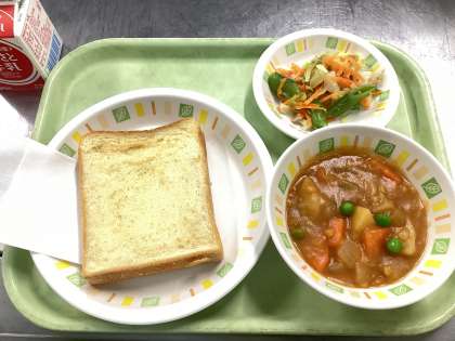 今日の給食は、シュガーバタートースト、ポークシチュー、スナップエンドウとツナのサラダ、牛乳です。