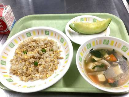 今日の給食は、そぼろごはん、けんちん汁、アンデスメロン、牛乳です。