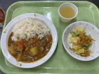 今日の給食は、七分つきごはん、ひじきのふりかけ、メルルーサのコーンマヨネーズ焼き、そら豆、豚汁、牛乳です。今日は3年生がそら豆をさやから出してくれました。