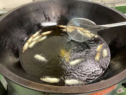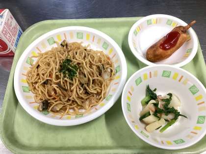 今日の給食は、海鮮オイスターソース焼きそば、かぶサラダ、アメリカンドック、牛乳です。