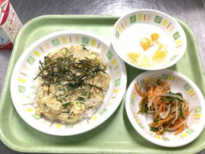 今日の給食は、親子丼、ピーマンのおひたし、フルーツヨーグルト、牛乳です。